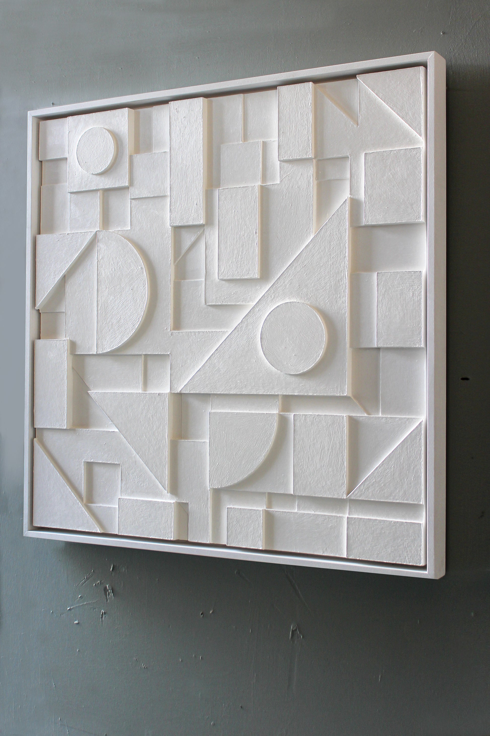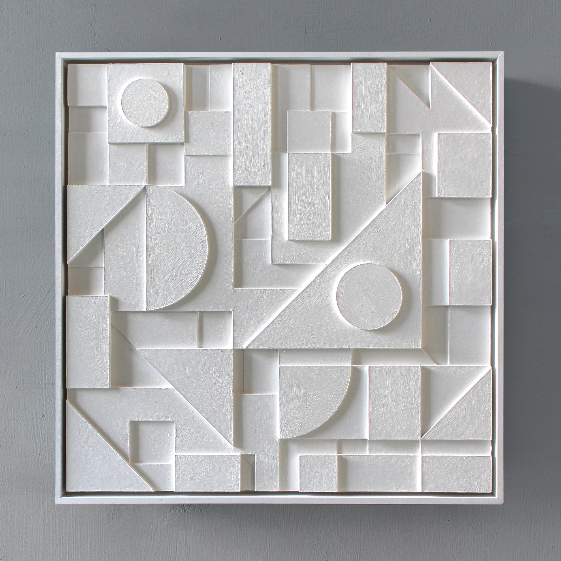 Composition158 is a handmade geometric relief painting, constructed using meticulously layered paper-based board. Each layer is shaped and arranged to create depth and dimension, then painted and sealed to ensure long-term protection and durability.